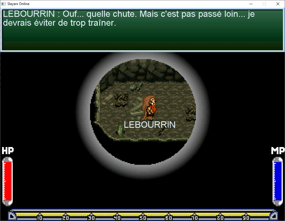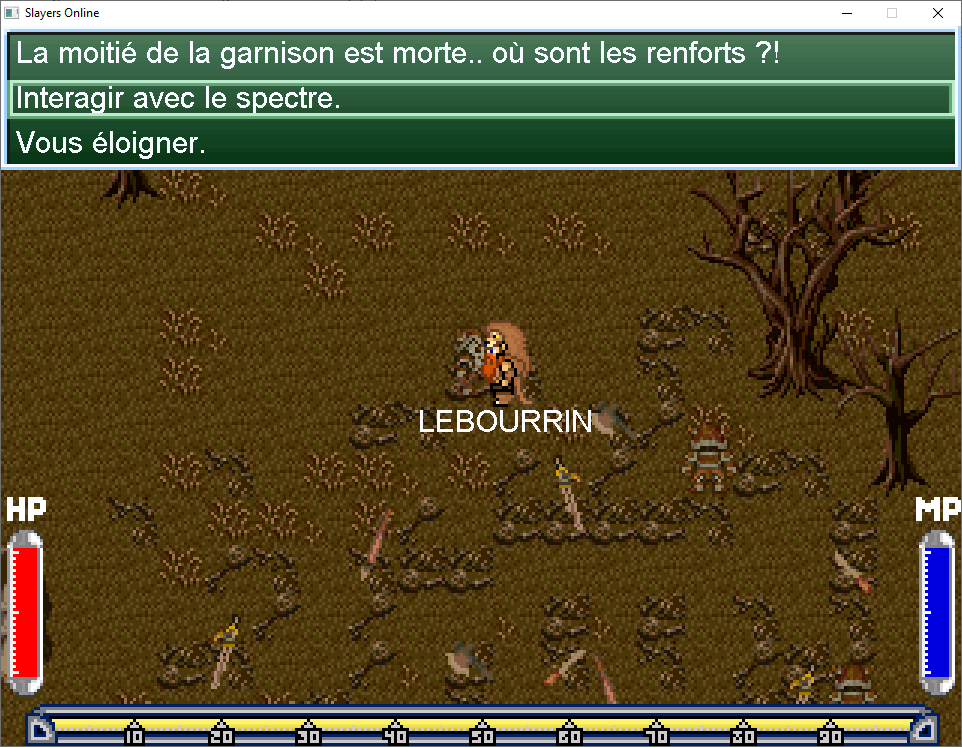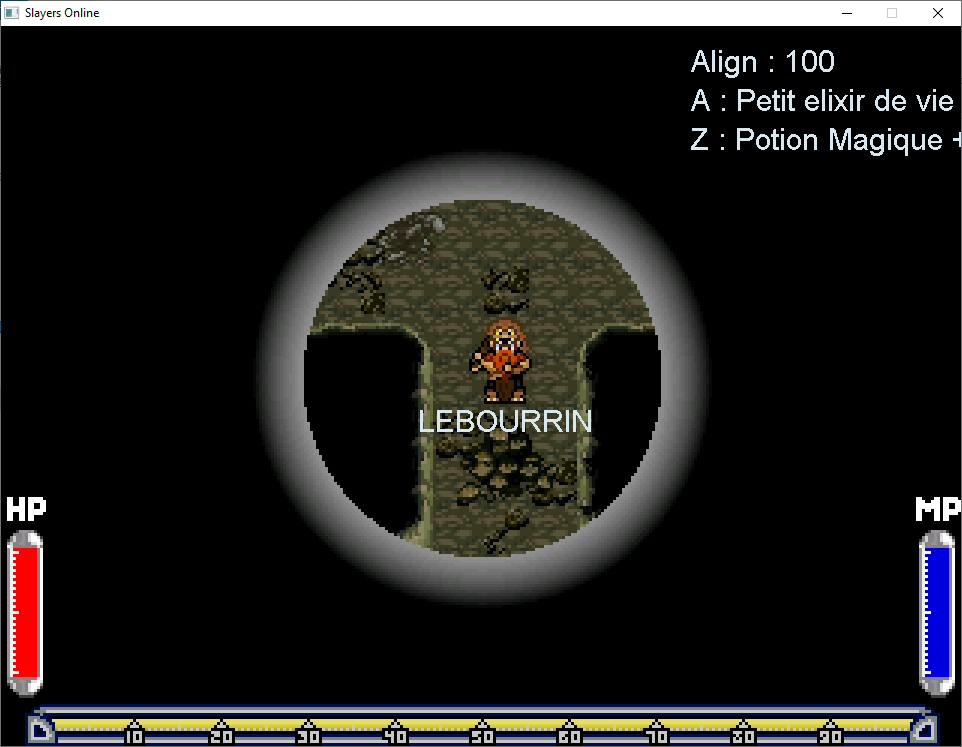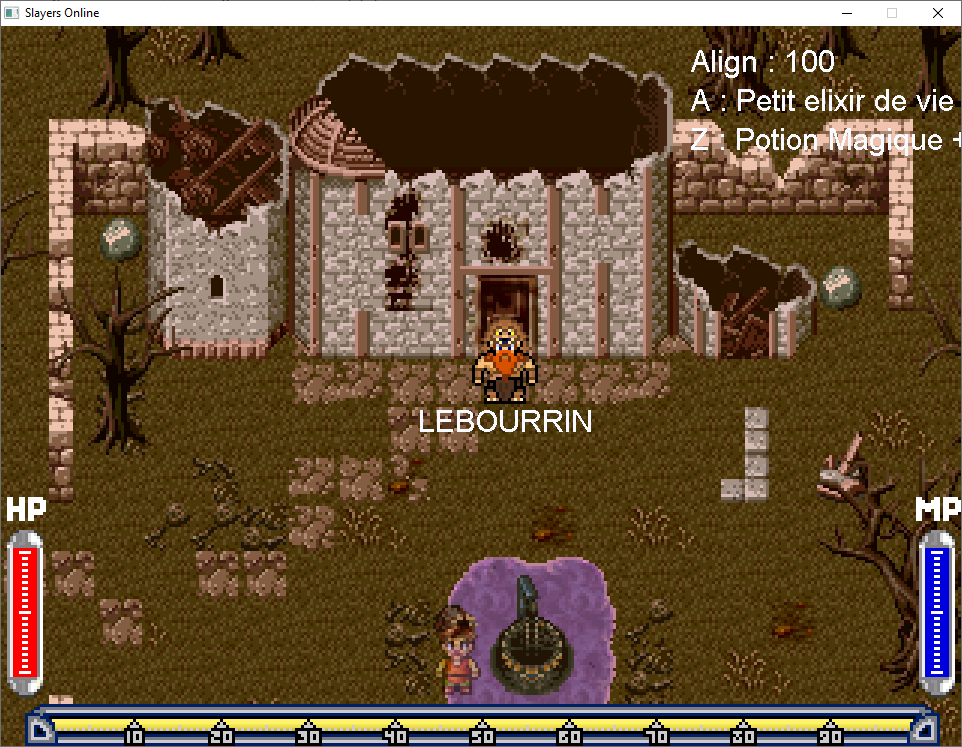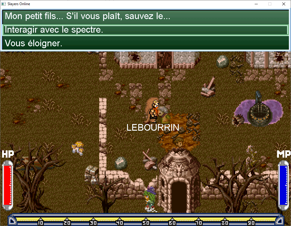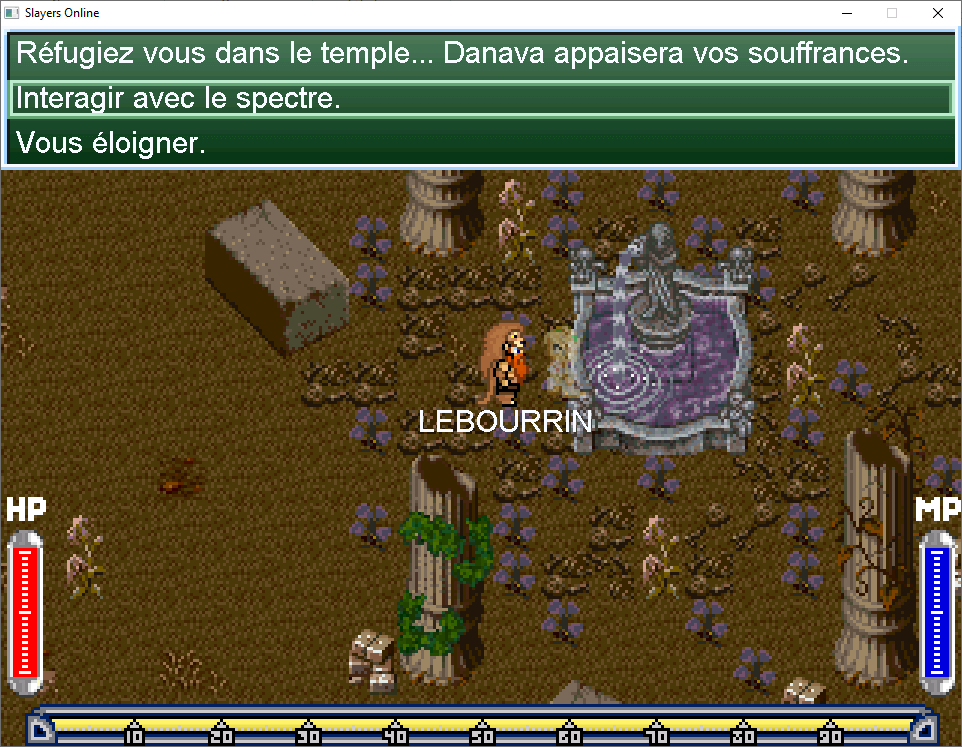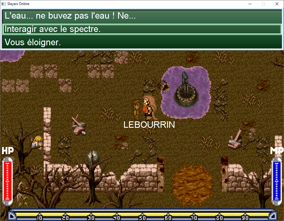 Vous arrivez dans une grotte, la fée vous permet, si vous le souhaitez, de remonter à la surface. Le squelette quant à lui vous permet de faire le plein de potions.