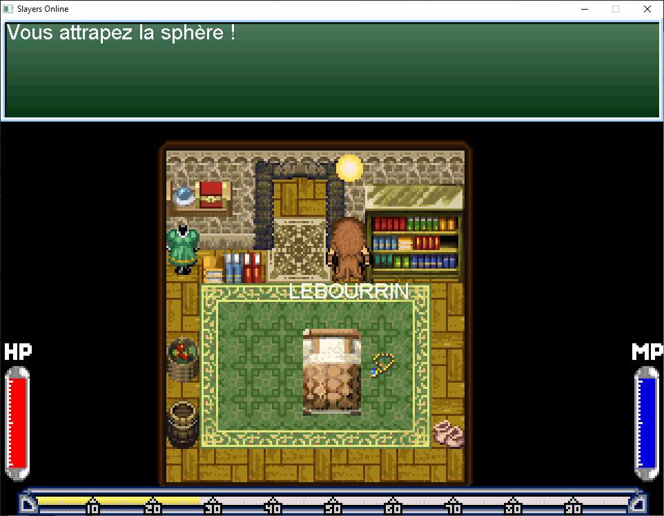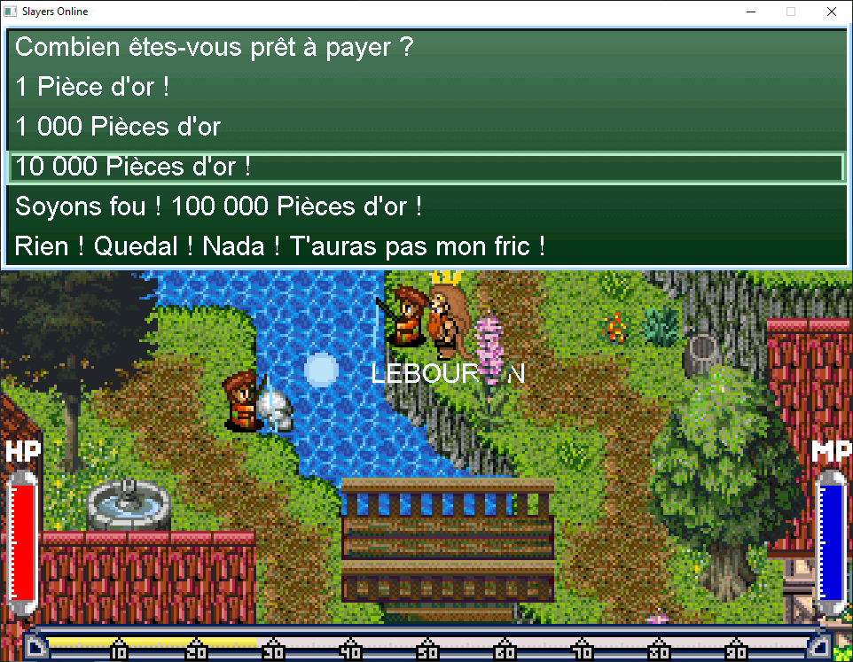 Allez vers la droite de la ville près de l’auberge et parlez au pêcheur en face d’une boule bleu au dessus de la rivière. Demandez lui de l’attraper pour vous avec sa canne à pêche. Vous pouvez lui donner soit 10 000 po soit 100 000 po, dans le second cas, il vous offrira en plus une épée Valor, à vous de voir.