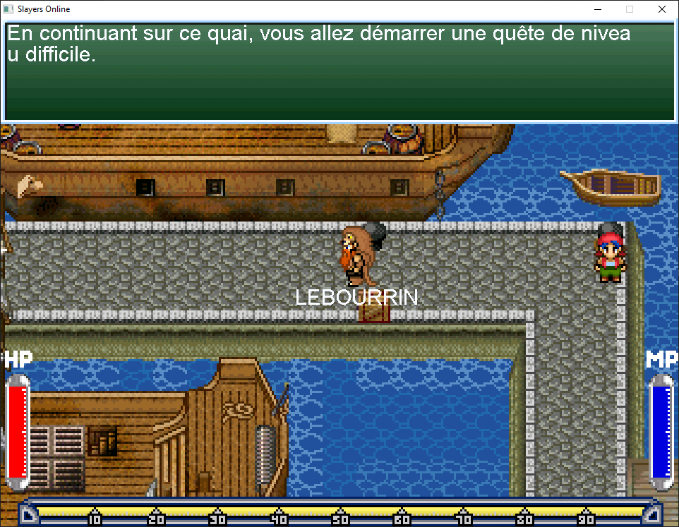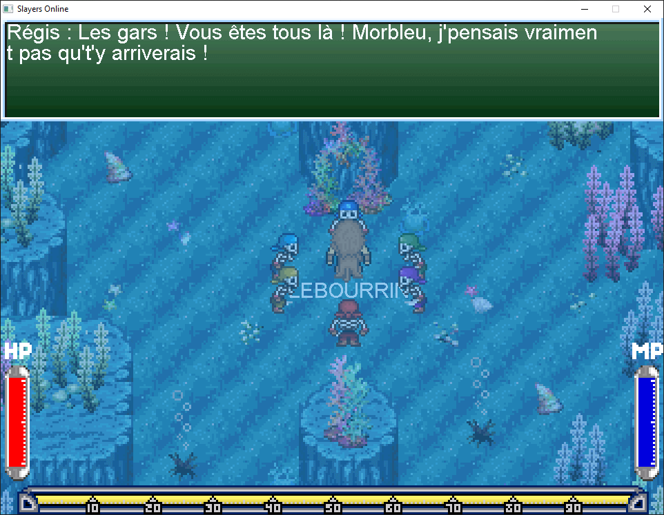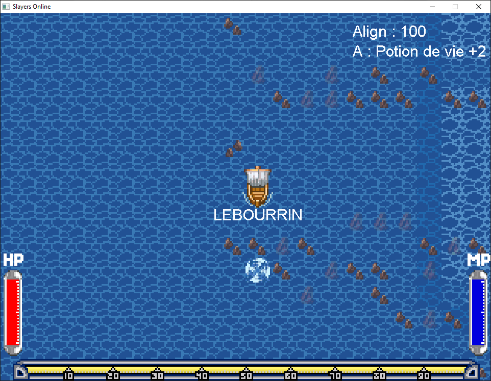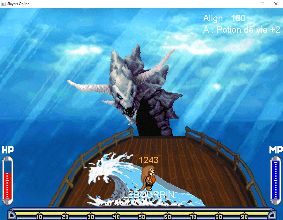Le dragon des mers comme tous les autres boss immobiles de Slayers Online ne se régénère pas si vous mourrez. Il utilise la magie Raz-de-marée qui peut vous toucher jusqu’à 5 fois avec des dégâts allant jusqu’à 2000. Si vous n’êtes pas très haut niveau je vous conseille de reculer lorsqu’il utilise cette magie pour ne pas vous faire en plus toucher par ses attaques classiques. Une fois les 5 vagues passées retournez au combat.