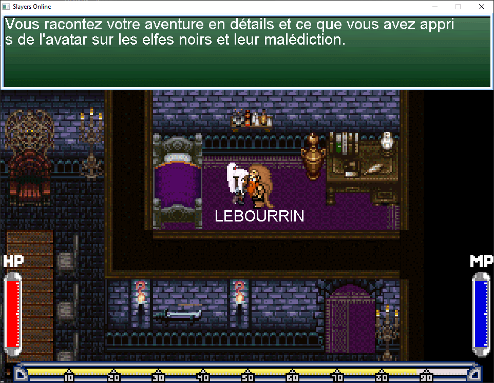 La matrone des elfes noirs se présente, elle s’appelle Liliam Url et vous demande la raison de votre venue ici. Vous lui expliquez avoir été envoyé ici par le capitaine elfe. Elle va vous confier un cimeterre et vous demande d’aller le montrer au capitaine elfe et lui dire que vous n’avez rien vu à part quelques elfes noirs que vous avez éliminé.