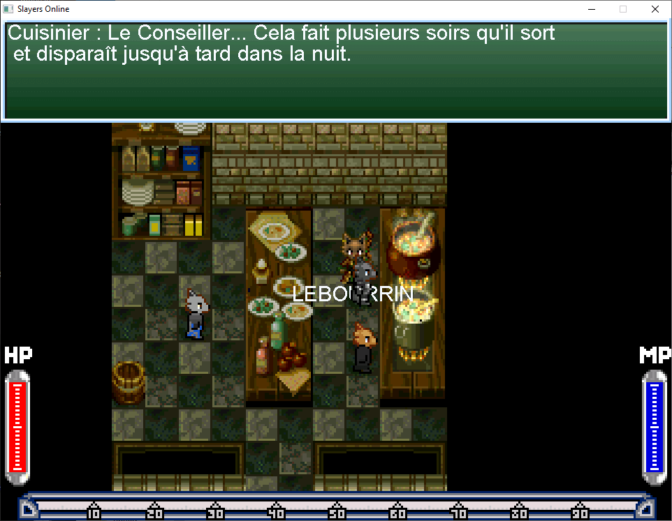 Allez remettre le parchemin à Naki, il vous demande d’enquêter discrètement sur le nouveau conseiller. Partez tout à droite du château dans les cuisines et parlez au cuisinier tout en noir, en haut à droite de la pièce. Il vous apprend que cela fait plusieurs soirs que le conseiller sort et disparait jusque tard dans la nuit et que la veille les gardes ont entendu une vache près de l’entrée.