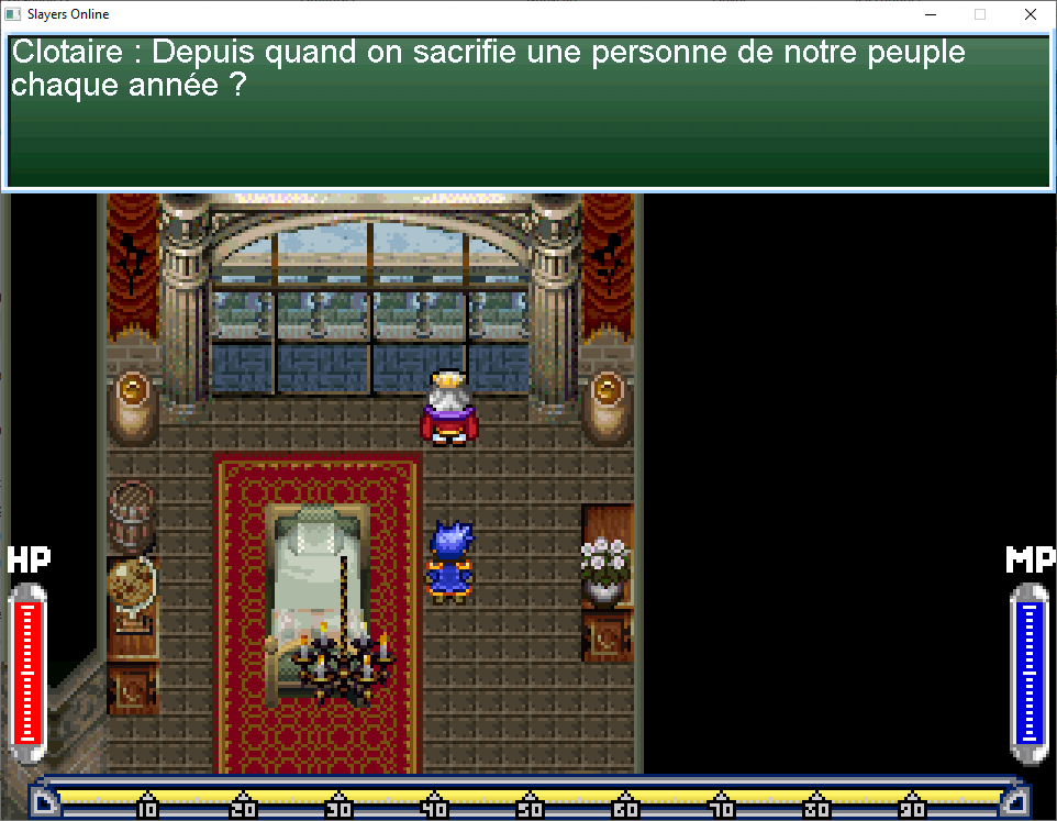 Il s’agit de la chambre du roi, vous interceptez une discussion entre Clotaire et Deen III. Il semblerait que le roi Deen III ait choisi de sacrifier une personne par an pour assurer la survie du royaume. Clotaire ne peut se résoudre à suivre la voie de son père et décide qu’il est temps de contre-attaquer.